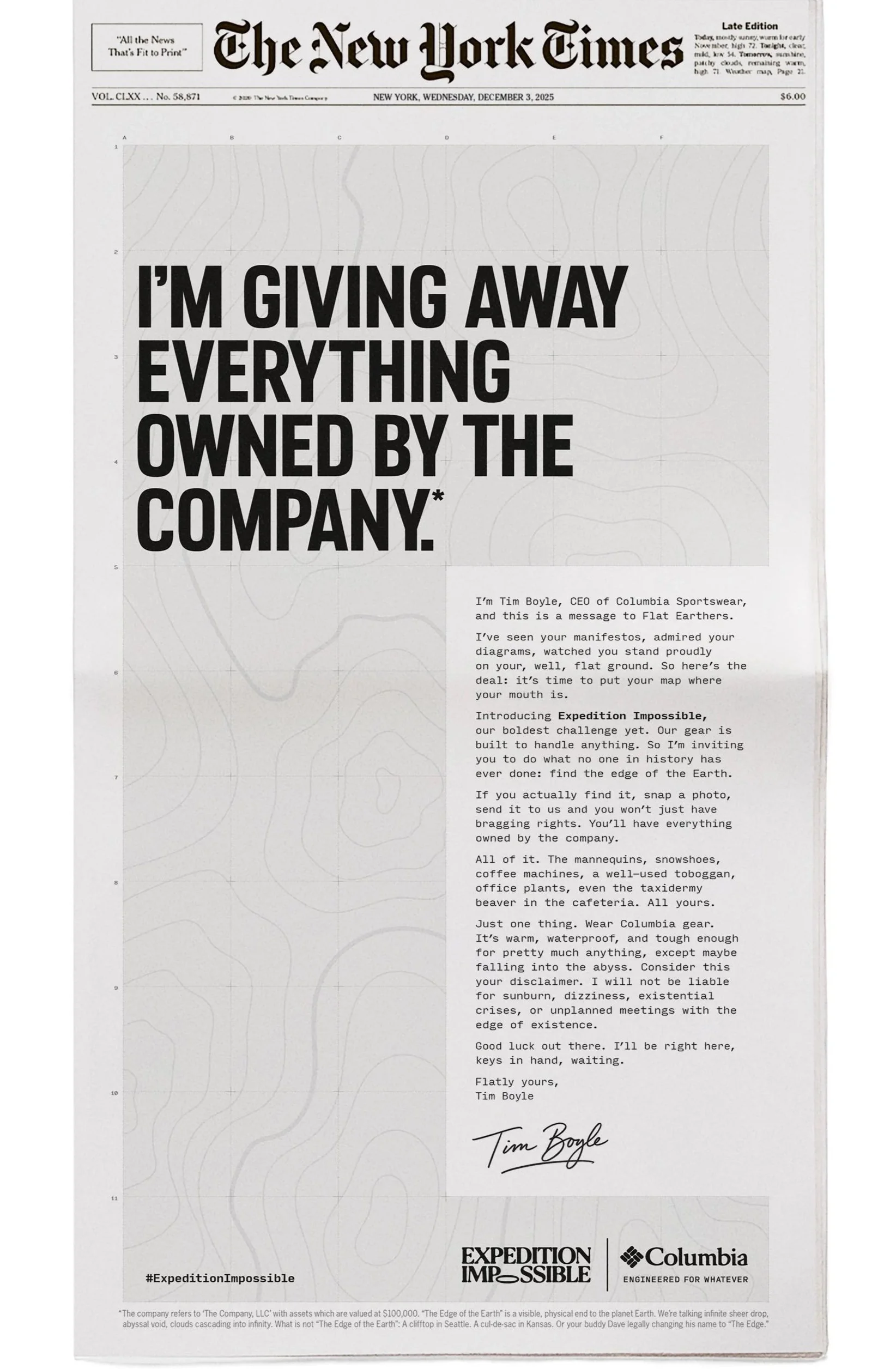 Columbia’s gear is so tough it can take you anywhere, even to the edge of the earth. To put that to the ultimate test we launched Expedition Impossible, a bold open invitation to the foil-hat brigade, the flat-earth faithful, and anyone who has ever typed “secret ice wall” into Google. The rules are simple. Find the edge, and you get everything the company owns. And this comes straight from CEO Tim Boyle, who said it with a very straight face.